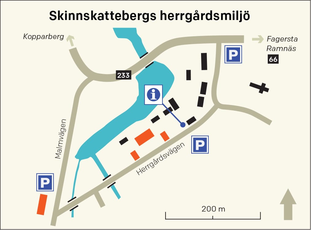 Det här är en vacker miljö mitt i Skinnskatteberg, centralt beläget nära kyrkan. Stor park, hembygdsgård i arbetarlängan på andra sidan strömmen. Under 1900-talet blev Skinnskatteberg en central ort för skogsindustrin och 1944 flyttade Skogsmästarskolan in i herrgården.