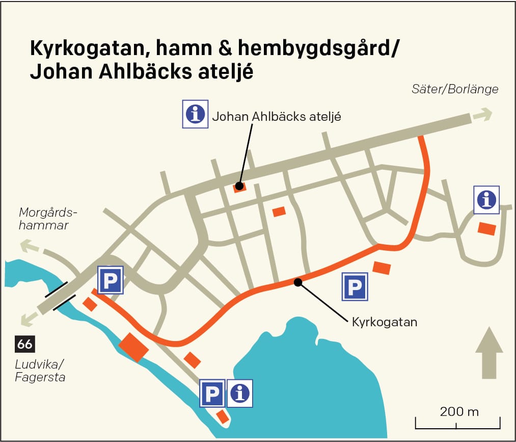 Följ Kyrkogatan via konstmuseet Arkivhuset och kyrkan till Norrbärke hembygdsgård och utforska området och resten av bergsmansbebyggelsen. Eller följ gatan mot valsverket och se de gamla industribyggnaderna och Meken, valsverkets före detta mekaniska verkstad.
